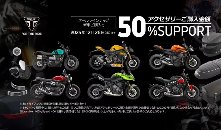 10月1日~12月末までの期間中、トライアンフ柏にて新車ご購入の注文時に、ご購入車両に適用の車体アクセサリー類を一緒にオーダーすると、アクセサリー類の通常希望小売価格(税込価格)から50%オフ!! で新車にアクセサリーパーツを取り付けることが可能となります。