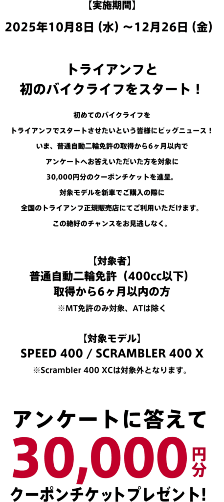 対象外:SCRAMBLER400XC, SpeedTriple RX,Tiger900/1200限定車,その他新モデル等