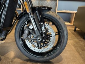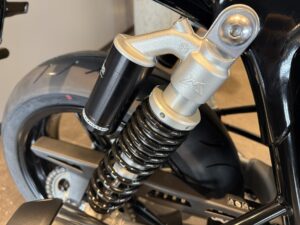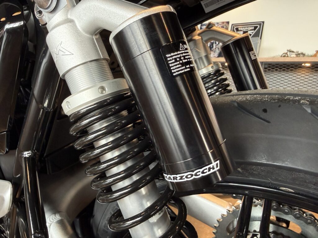 リアサスペンション オーリンズ製ツインRSU、外付けリザーバー、プリロード、圧側減衰力、伸側減衰力の調整可能、ホイールトラベル123mm
